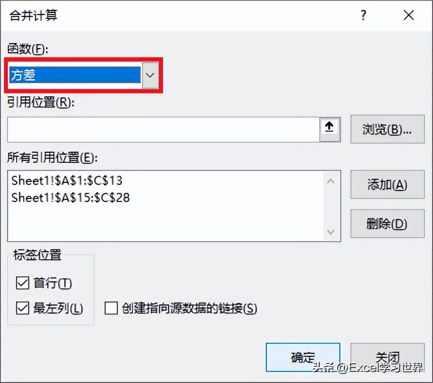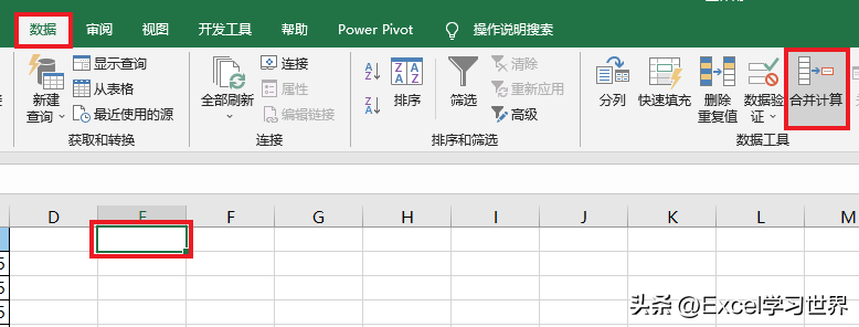 1. 选中要放置差异结果的目标单元格 --> 选择菜单栏的“数据”-->“合并计算”