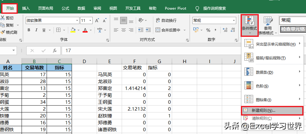 7. 选择菜单栏的“开始”-->“条件格式”-->“新建规则”