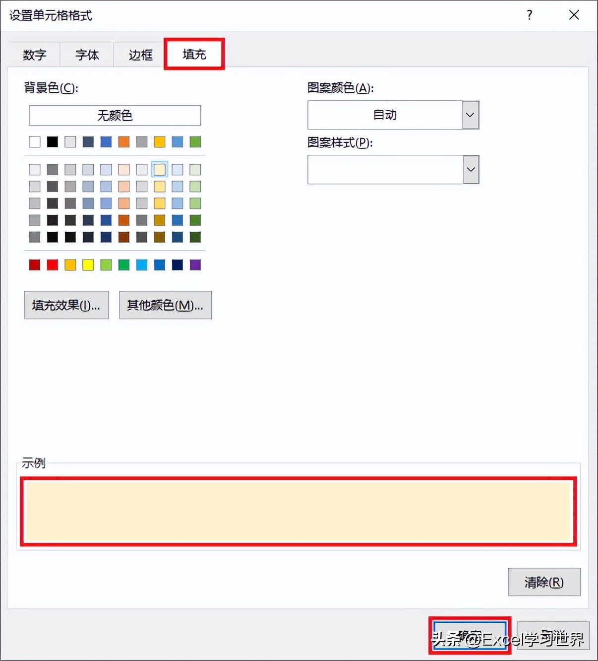 9. 在弹出的对话框中选择“填充”选项卡 --> 选择所需的填充色 --> 点击“确定”