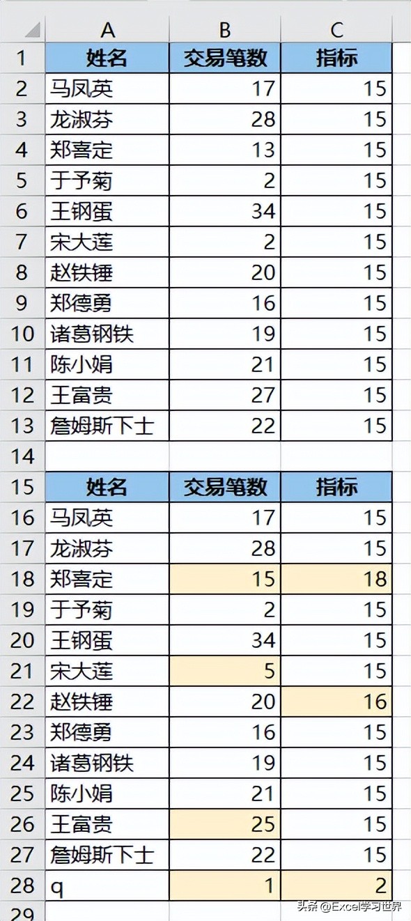 比较下图 1 中的上下两个数据表,将有差异的单元格高亮显示出来。