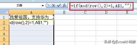 - IF(MOD(ROW(),2)=1,A$1,""):整个公式的含义是如果当前行的行数为奇数(除以 2 余 1),则当前单元格 =A$1,否则就显示空值