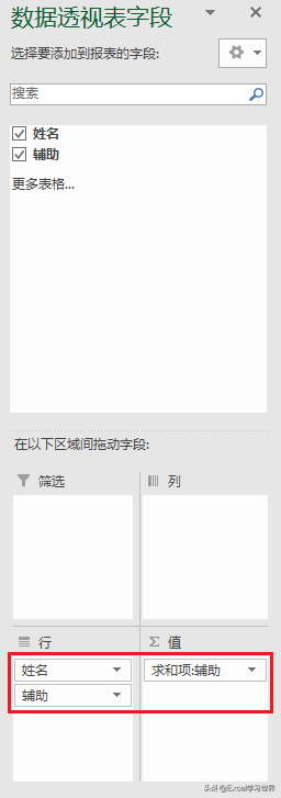 5. 在右侧的“数据透视表字段”区域,按以下方式拖动字段: