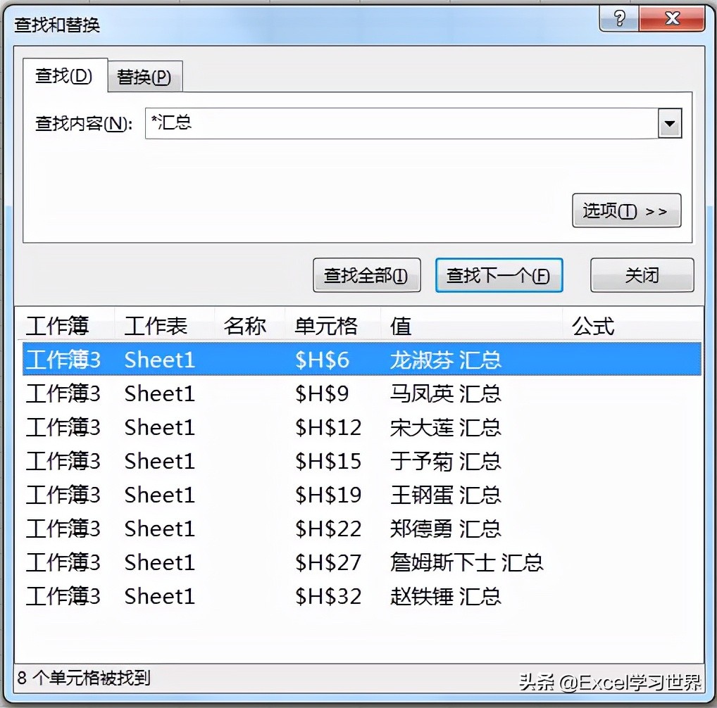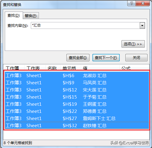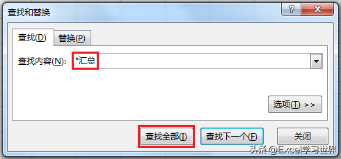 12. 保持选中刚才粘贴的区域 --> 按 Ctrl+F --> 在“查找内容”区域输入“*汇总”--> 点击“查找全部”