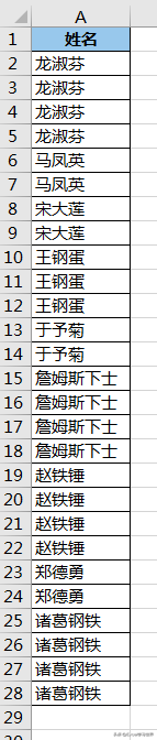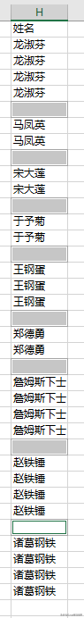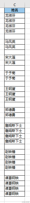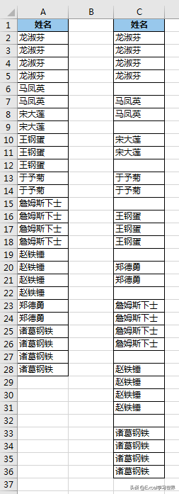 在下图 1 中的所有不同姓名之间插入一个空行,效果如下图 2 所示。