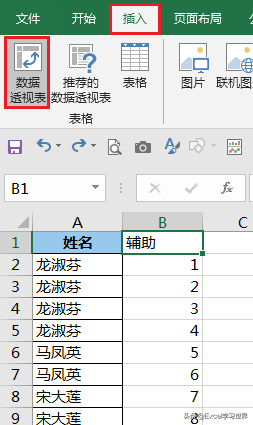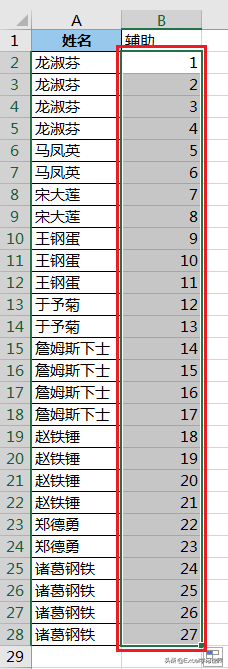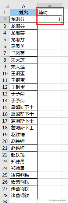 1. 将 B 列设置为辅助列,在 B2 单元格中输入“1”