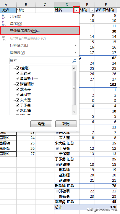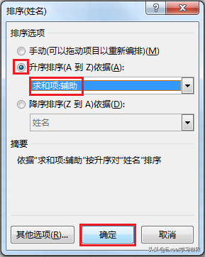 9. 在弹出的对话框中选择“升序排序(A 到 Z)依据(A)”--> 在下拉菜单中选择“求和项:辅助”--> 点击“确定”