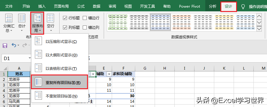 7. 保持选中数据透视表的任意单元格 --> 选择菜单栏的“设计”-->“报表布局”-->“重复所有项目标签”