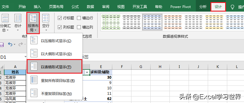 6. 选中数据透视表的任意单元格 --> 选择菜单栏的“设计”-->“报表布局”-->“以表格形式显示”