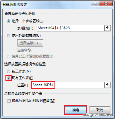 4. 在弹出的对话框中选择“现有工作表”及所需上传至的位置 --> 点击“确定”