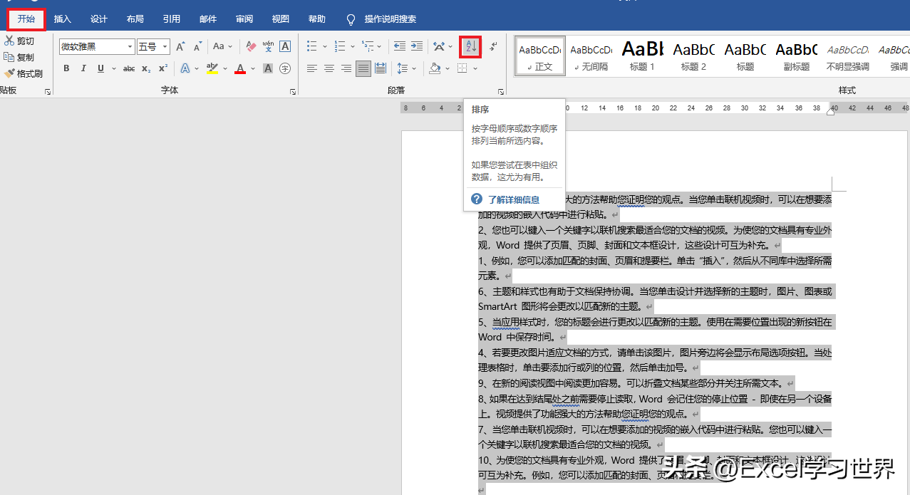 2. 选中需要排序的所有内容 --> 选择菜单栏的“开始”-->“排序”