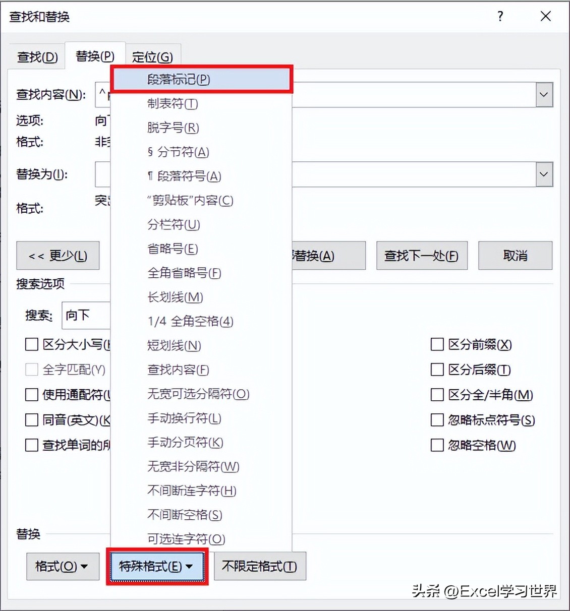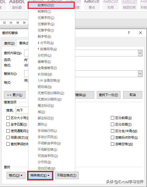6. 将光标放置到“查找内容”文本框内,点击“特殊格式”--> 选择“段落标记”