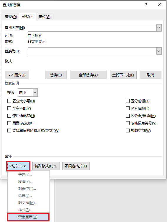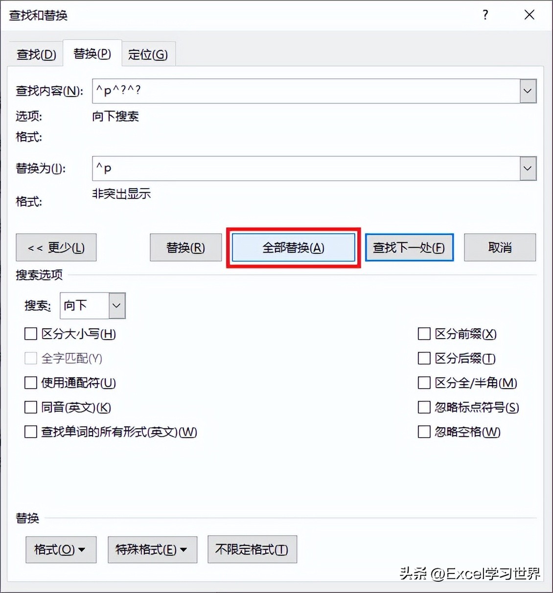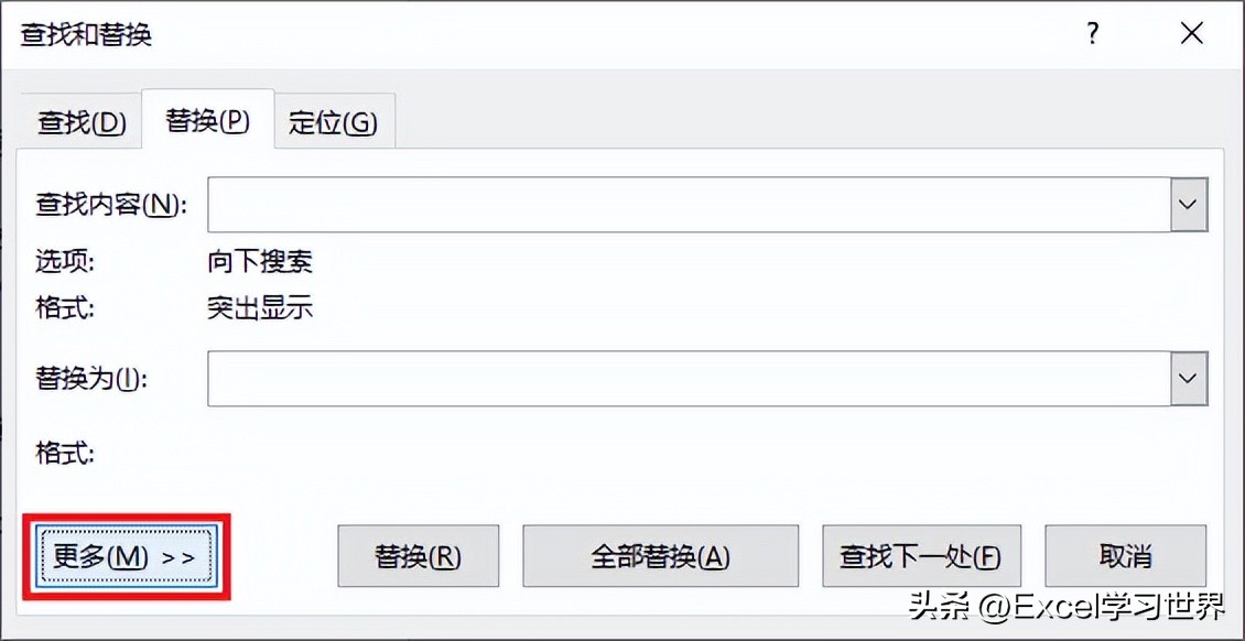 4. 全选所有内容 --> 按 Ctrl+H --> 在弹出的对话框中点击“更多”按钮