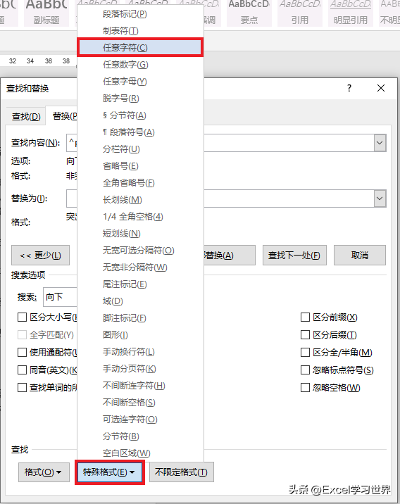 8. 再次点击“特殊格式”--> 选择“任意字符”