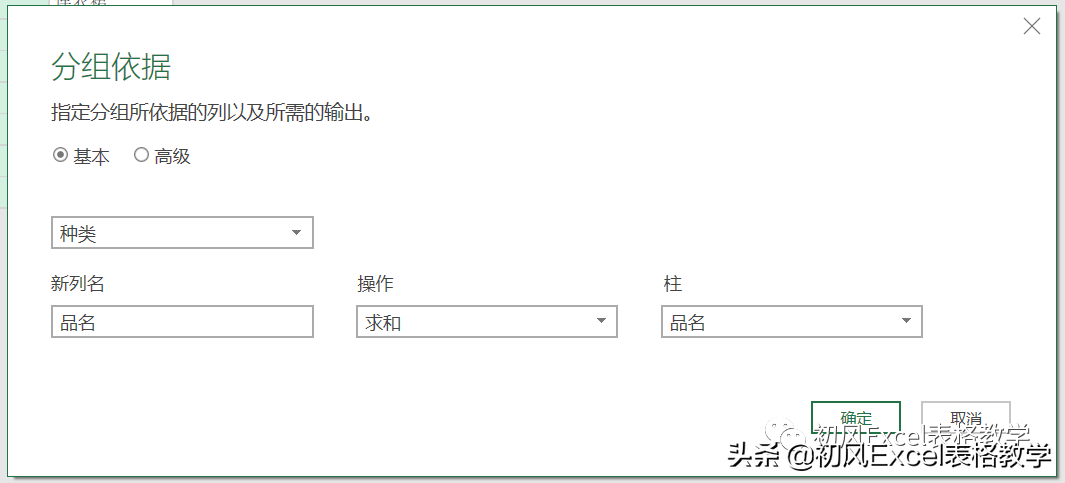 在弹出的【分组依据】对话框中,分组依据选择【种类】,【新列名】输入“品名”,【操作】选择【求和】,【柱】选择【品名】。单击确定。