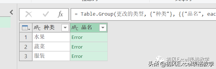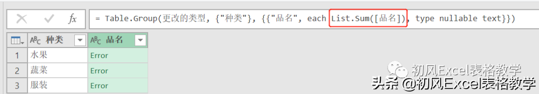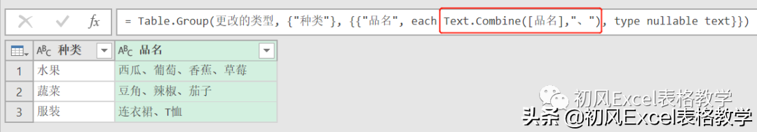 3、将公式中的“List.Sum([品名])”修改为“Text.Combine([品名],"、")”。