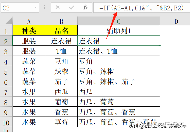 =IF(A2=A1,C1&"、"&B2,B2)
