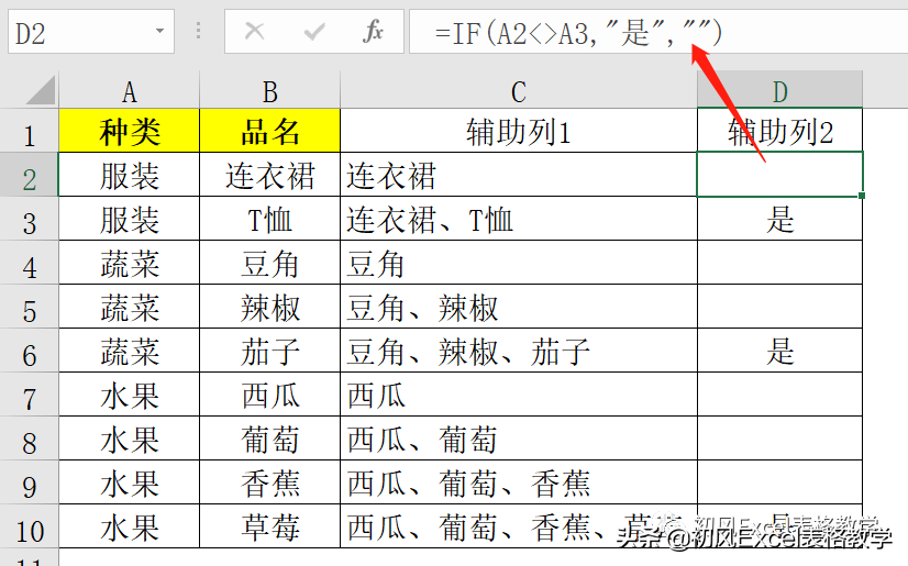 3、在D2单元格输入公式:=IF(A2<>A3,"是","")