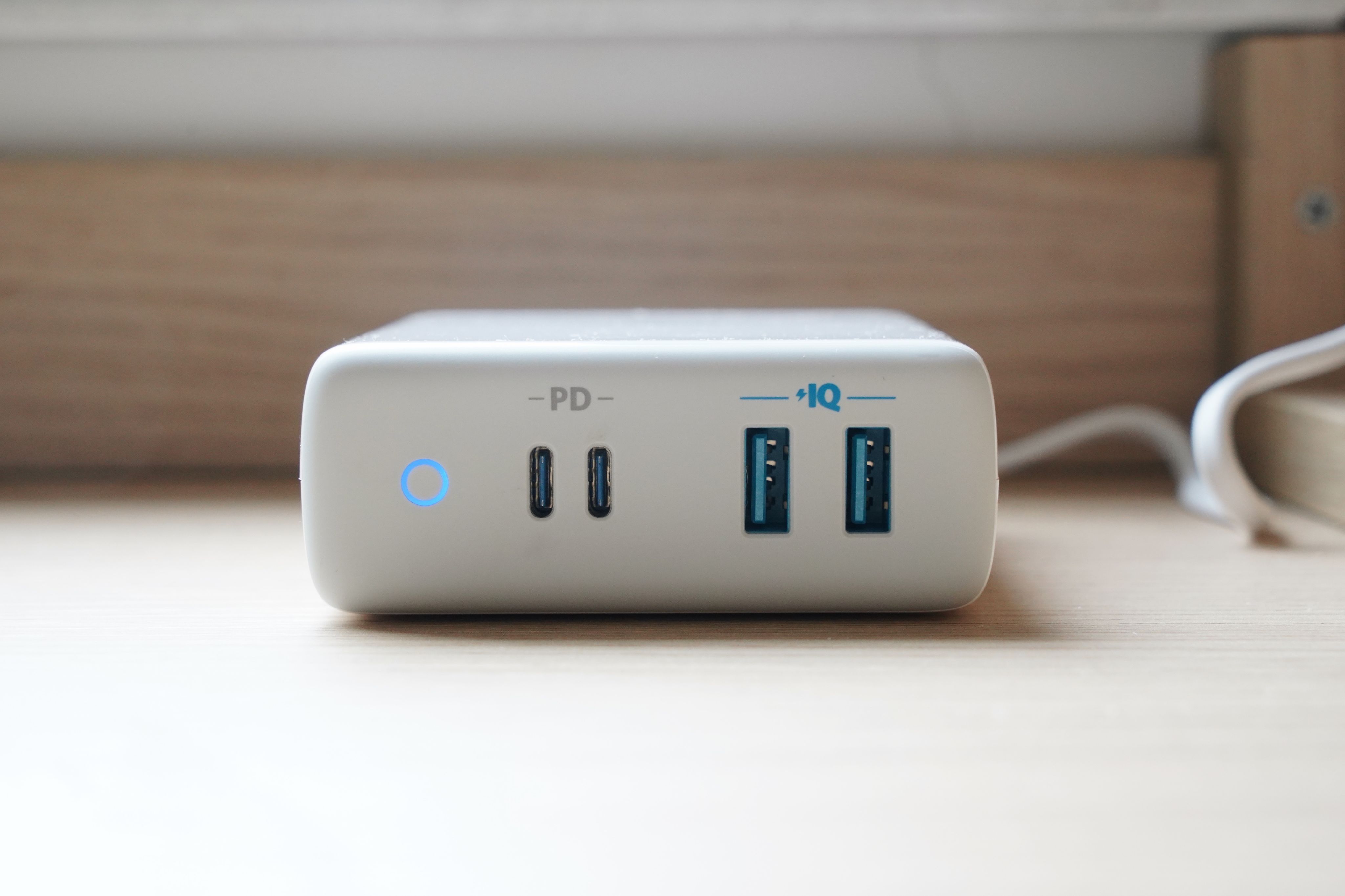 在家桌面上常备的是Anker GaN 100W 适配器,2个USB-C,2个USB-A,C单口可以最高提供100W的PD快充,A口则是最高12W。