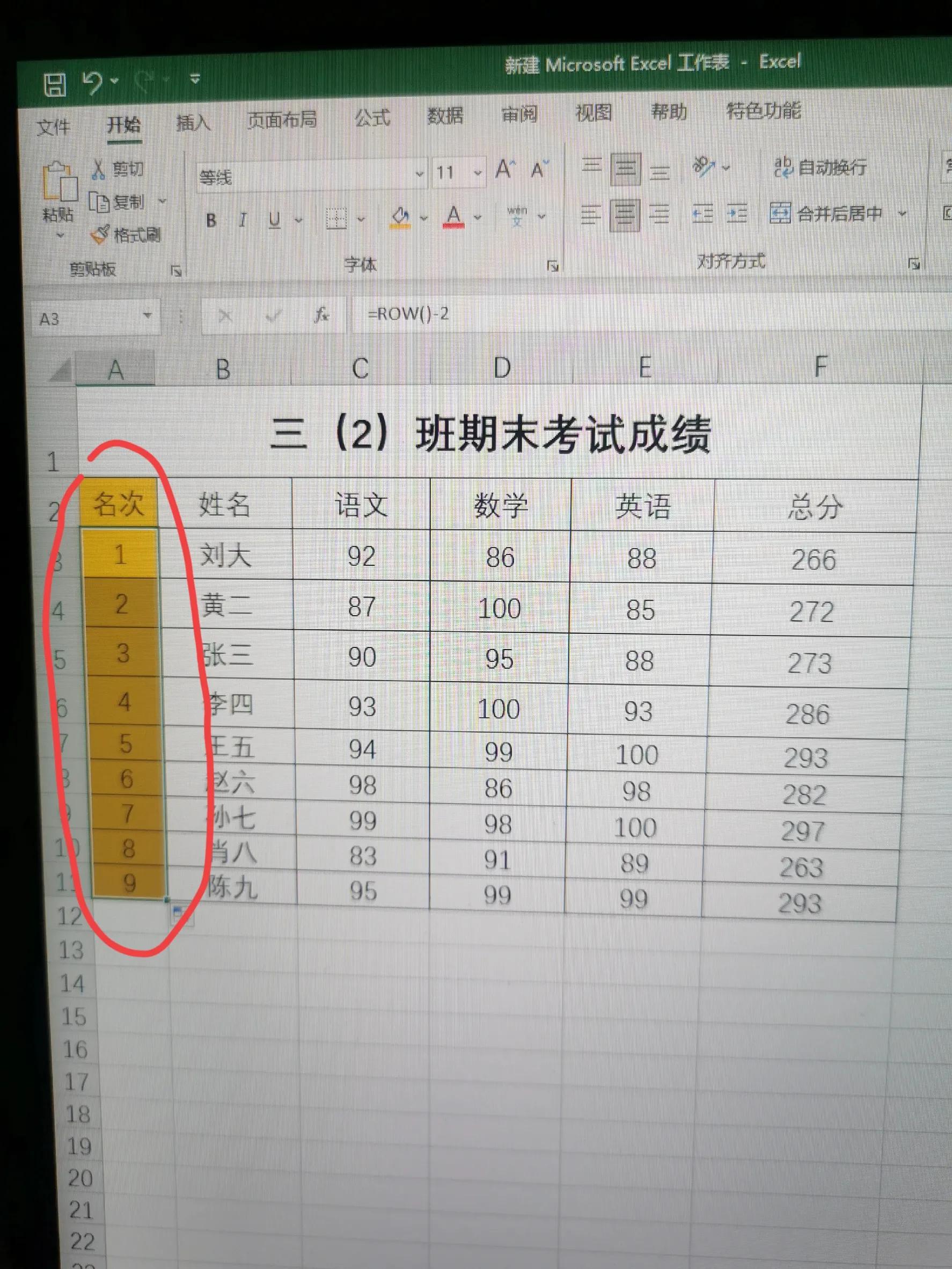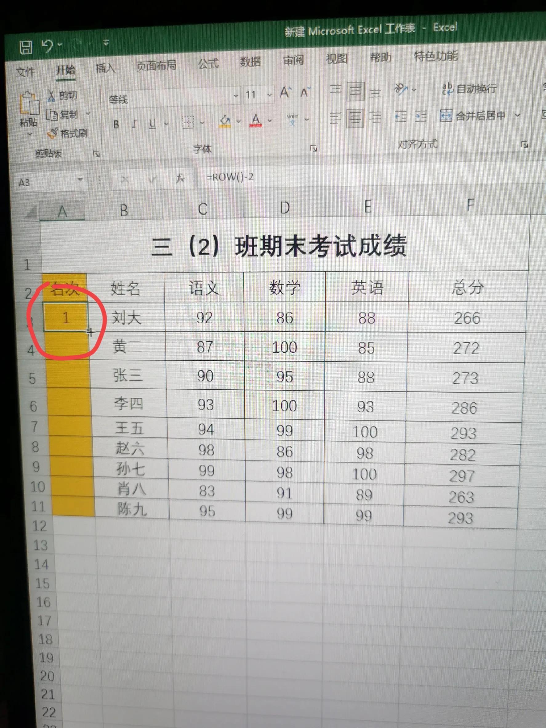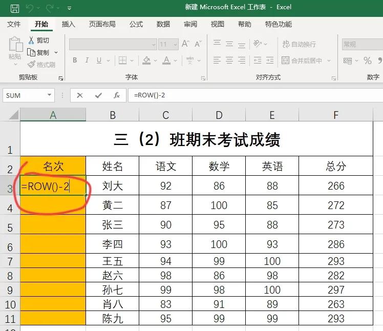 第二步:用鼠标左键单击单元格A3,选中单元格,在单元格内输入“=ROW()-2”,按enter键回车。结果显示数字1。注意这里的公式中意思是用行数字减去2得到1,如果在第四行,那就输入减3,目的就是让这个单元格一直显示数字1。