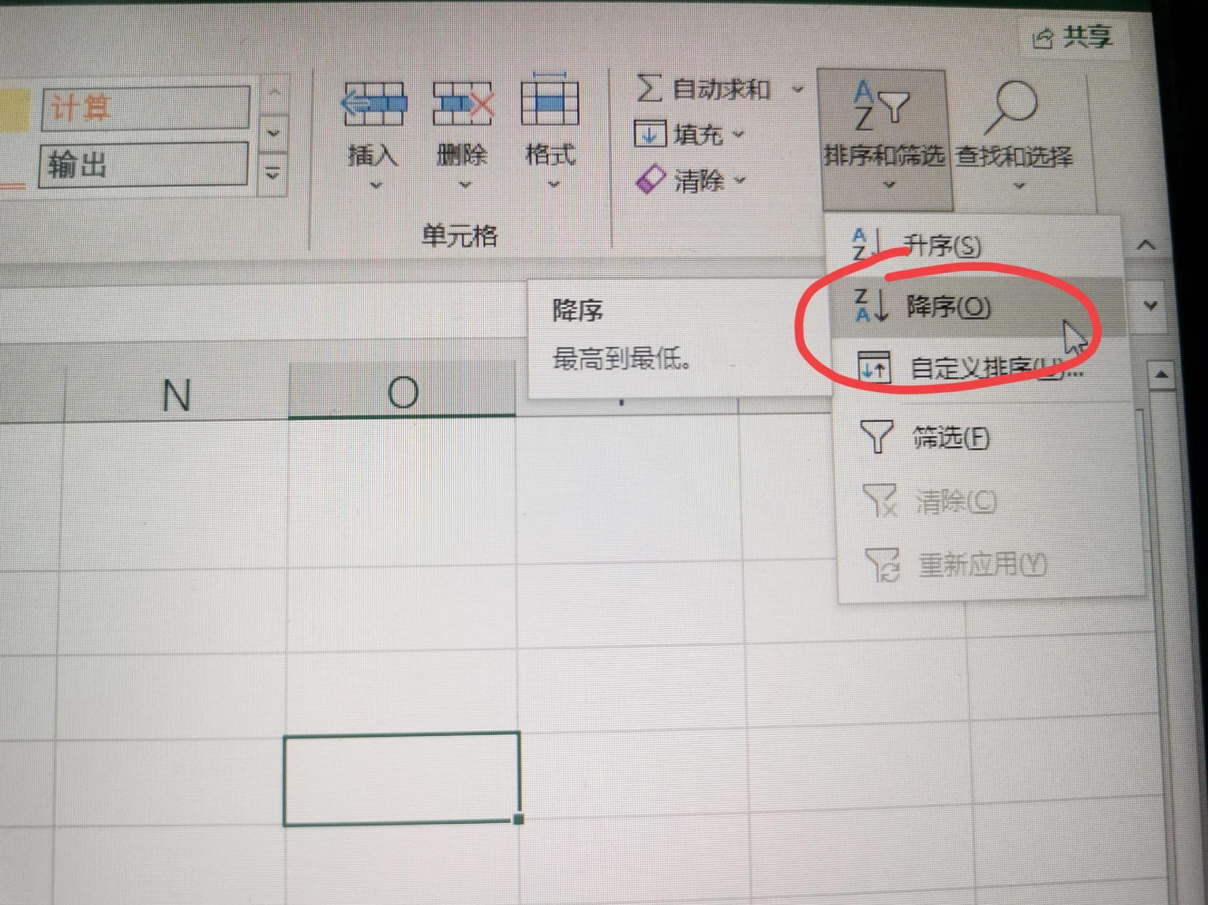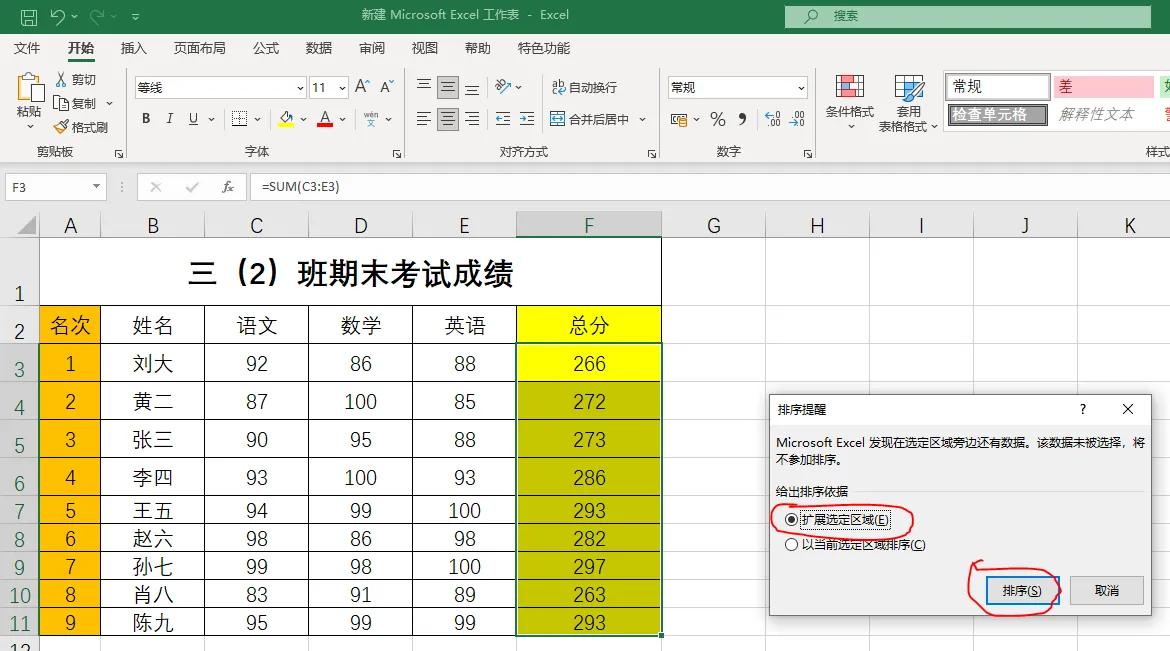 第四步:用鼠标左键选中F3到F11区域数据,点击工具栏中“排序和筛选”(此处也可以在选定的单元格上点击鼠标右键),出现下拉菜单,点击“降序”,出现对话框排序提醒,选择第一项“扩展选定区域”,然后点排序。排序完成。