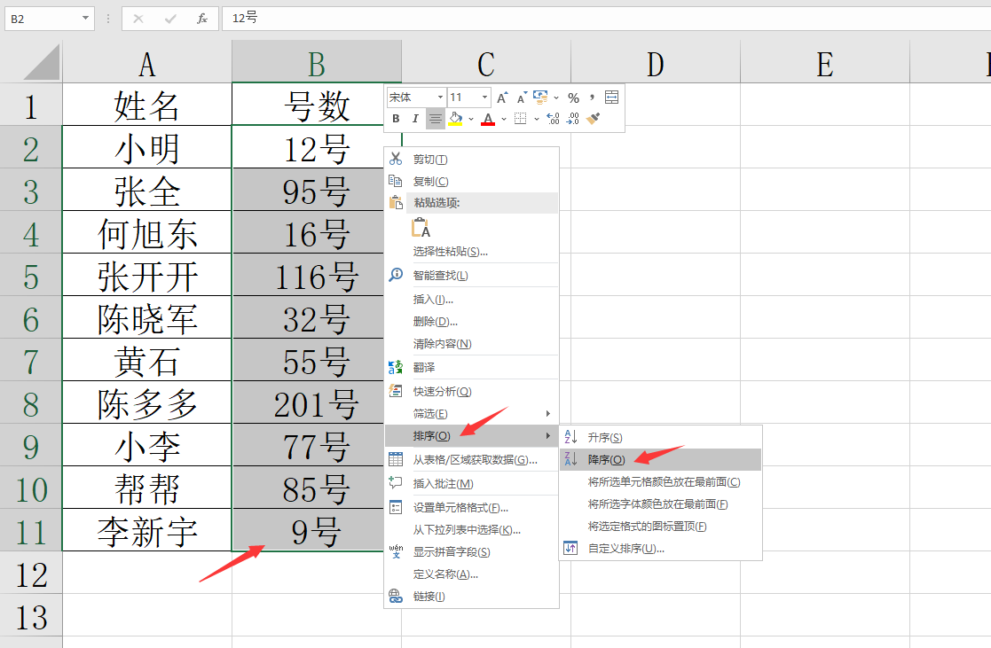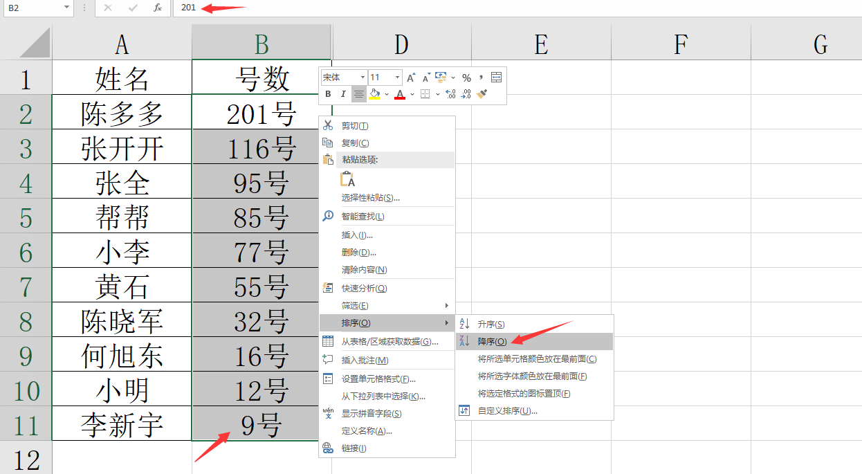 メ传统做法:框选B列数据——右键——排序降序。メ