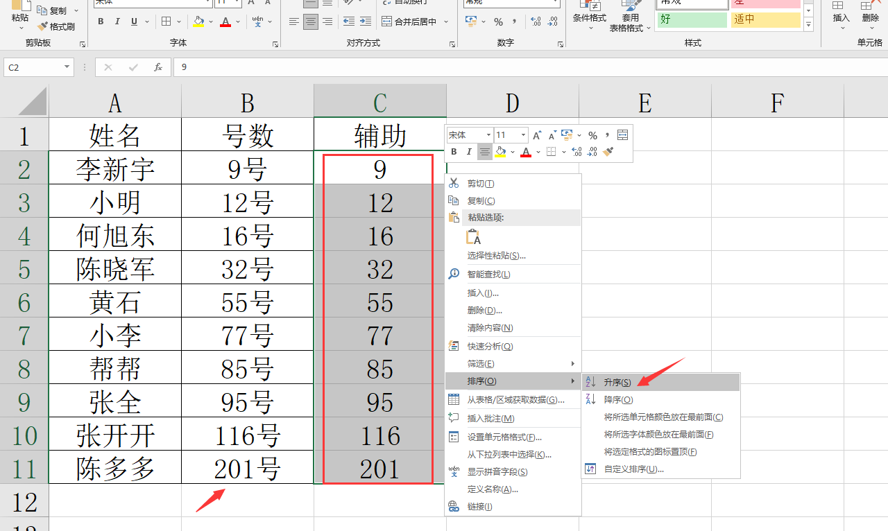 メ然后同理,我们将C列排序,B列带文字的数字就能正常排序。メ