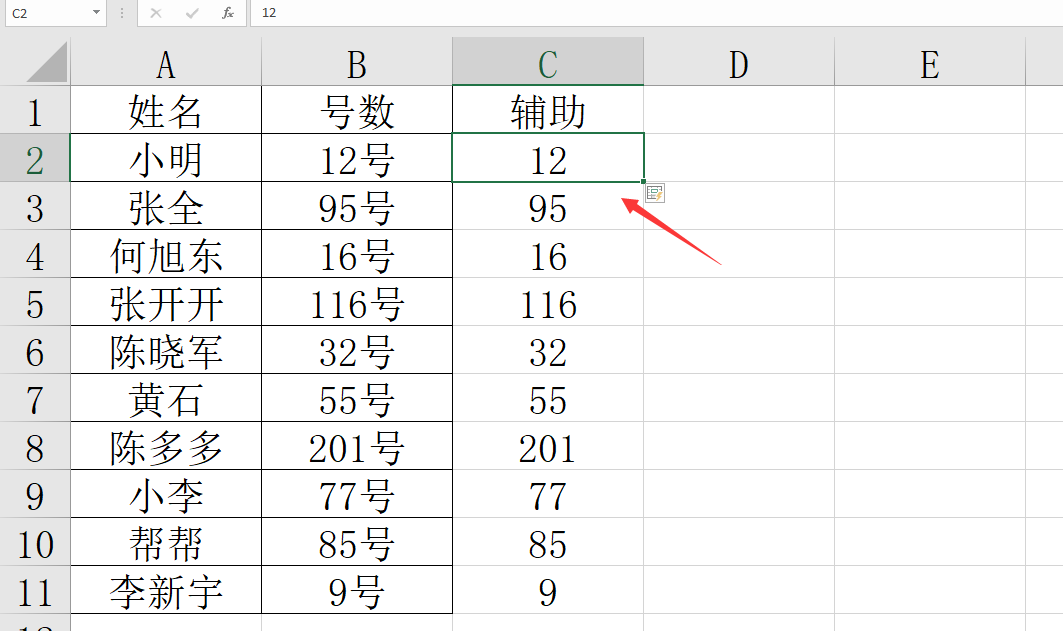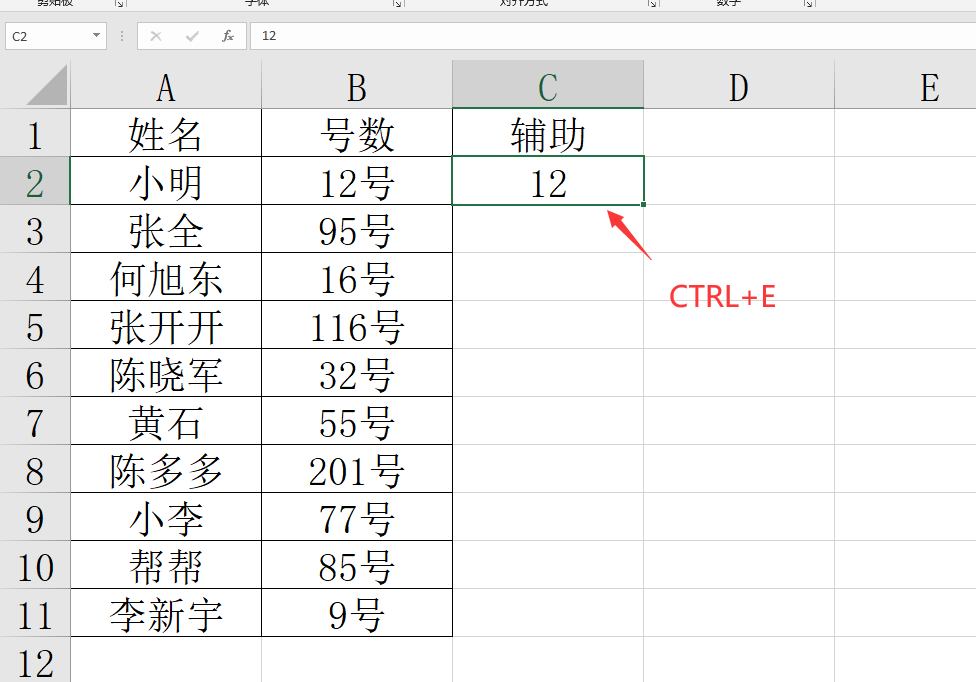 メ这里我们可以添加一个辅助列,首个单元格输入正确的数字12,直接按下CTRL+E(快速填充,该功能要office2013(含)以上版本才可以使用)。メ