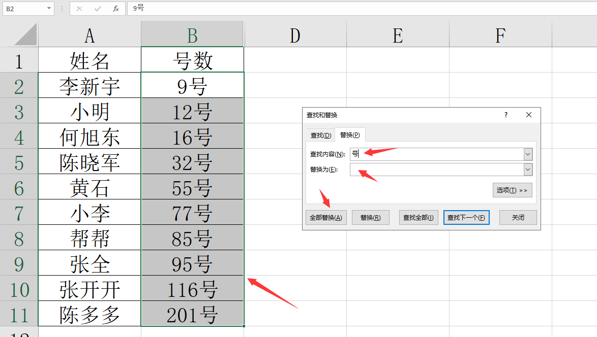 メ第二种方法,我们框选B列单元格——CTRL+H(替换)——查找内容“号”,替换为空着,点击全部替换,把计数单位文字批量删除。メ