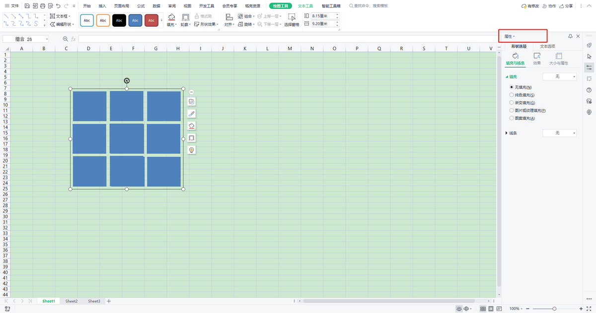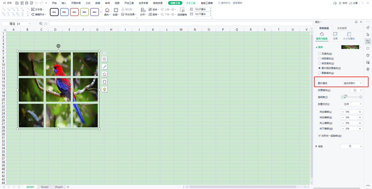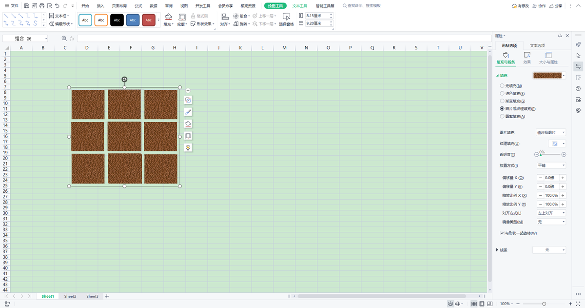 12、我们在“填充与线条”选项中,选择“图片或纹理填充”,可以看到刚刚的九宫格变成了纹理图形;