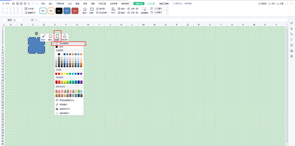6、画好后,鼠标右键,弹出下拉选项后,我们选择轮廓,将正方形的轮廓设置成“无边框颜色”;