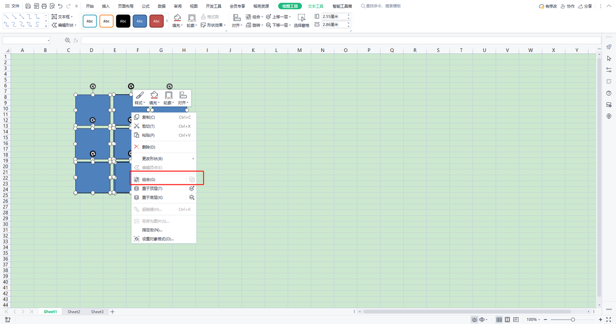 9、我们再用鼠标选中任意正方形,使用Ctrl+A全选,鼠标右键,弹出下拉选项后,选择“组合”
