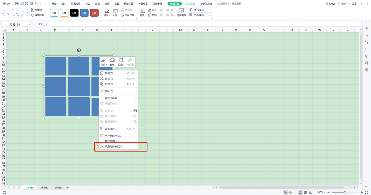 10、将正方形组合后,再右键鼠标,这时又弹出下拉选项,我们再选择“设置对象格式”;