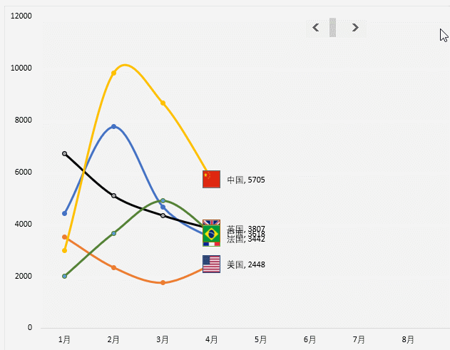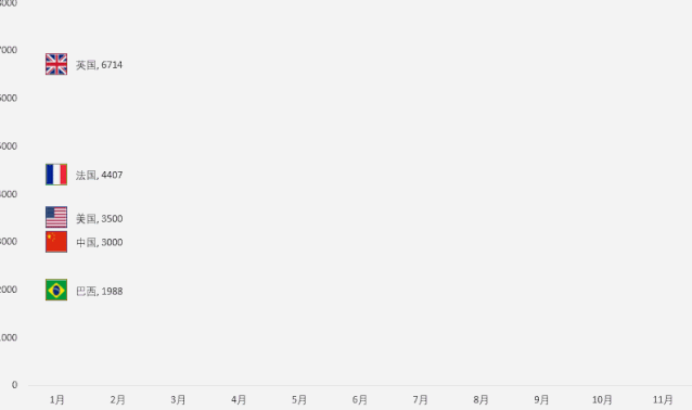 复制插入的中国图标 - 选取中国系列的最后一个数据点 - 添加数据标签 - 填充 - 标记 - 内置大小 20 ; 通过剪贴板进行图片填充。