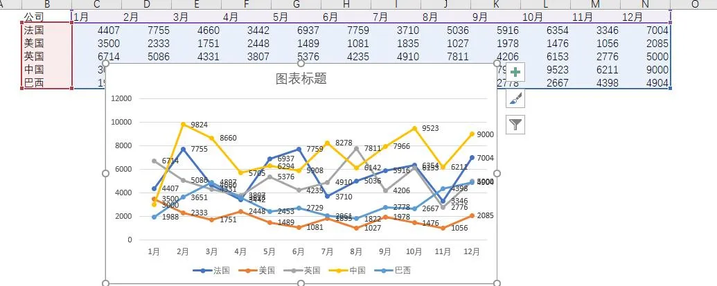 用同样的步骤进行其他折线图的设置。最后删除多余的图表元素,完成动态折线图的制作。