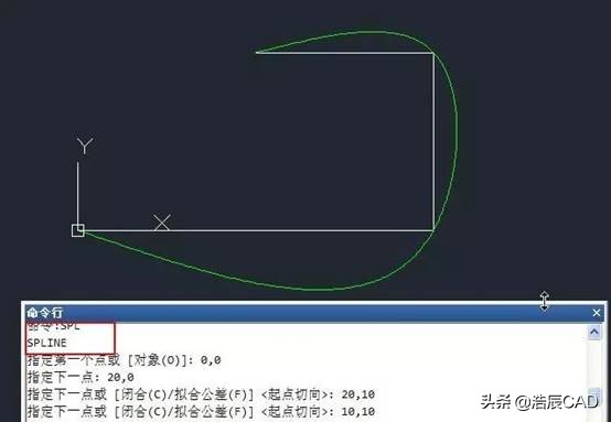 上面只是为了练习功能,输入了几个简单的坐标并绘制了简单的直线,在实际工作中,我们的EXCEL表格中可以有上百个点的坐标,而且可以在执行多段线PL或样条曲线SPL后粘贴坐标来绘制复杂的曲线。假如我们执行SPL命令后仍粘贴上面的坐标,就会得到一条如下图所示的样条曲线。