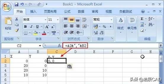 单击X,Y列的第一个空单元格,也就是上图中的单元格C2,在顶部fx公式栏输入公式=A2&","&B2,就可以将XY坐标合并成需要的格式了,如下图所示。