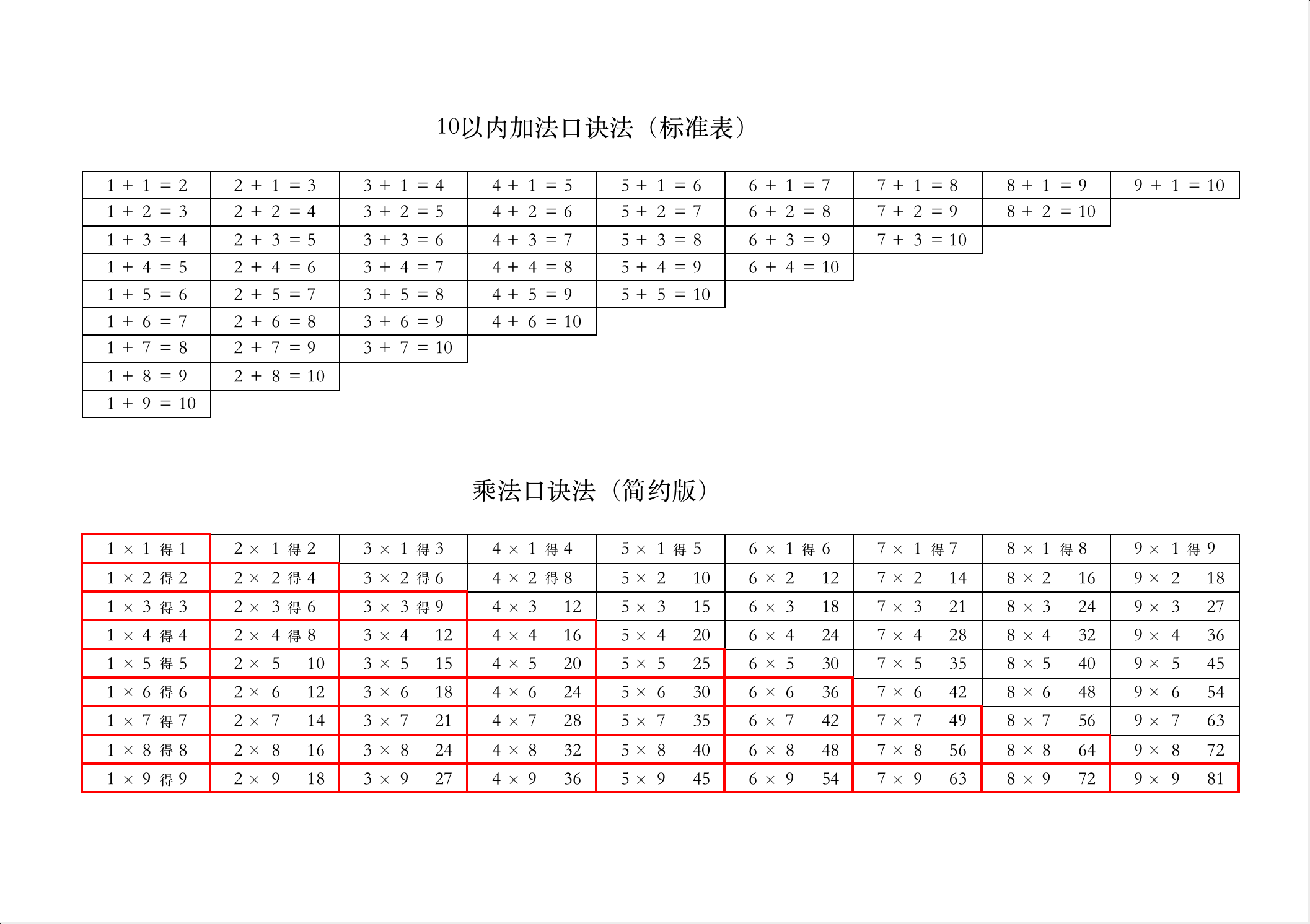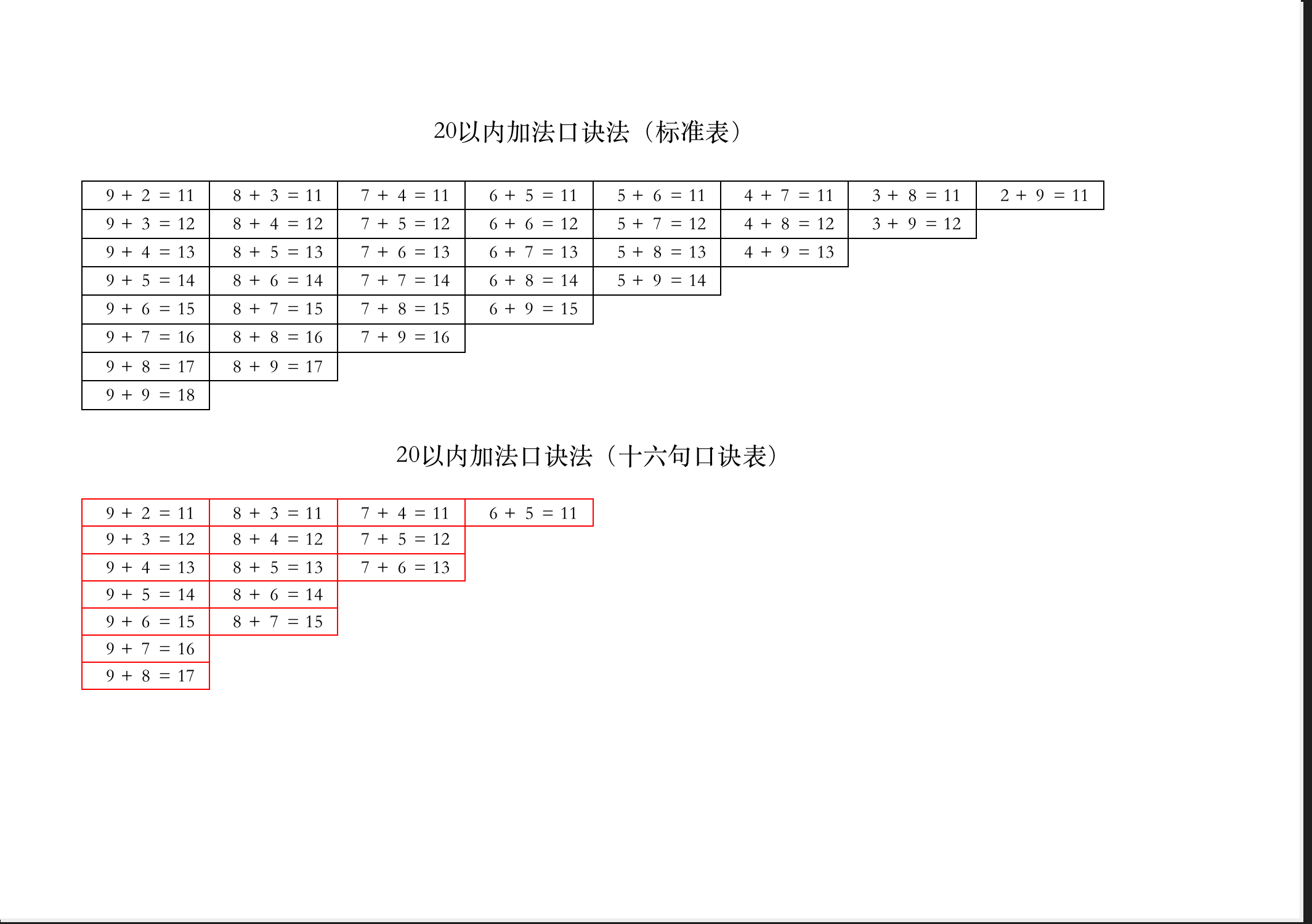 了解了情况后,我决定先抓计算,计算能力应该算是贯穿整个小学的,然后想起抖音上那个姓刘的老师(为避免别人说我是在广告,我就不说谁了)讲了一个加法的16句口诀表的视频,我想试试,结果居然没想到居然全网都搜不到。不仅文档的搜不到,连图片的都搜不到。所以我就花了点时间用excel 做了一张表,看了看,我觉得有用的,可能你们也有用,发上来了给你们看看。至于表格版的我不知道怎么可以给大家。
