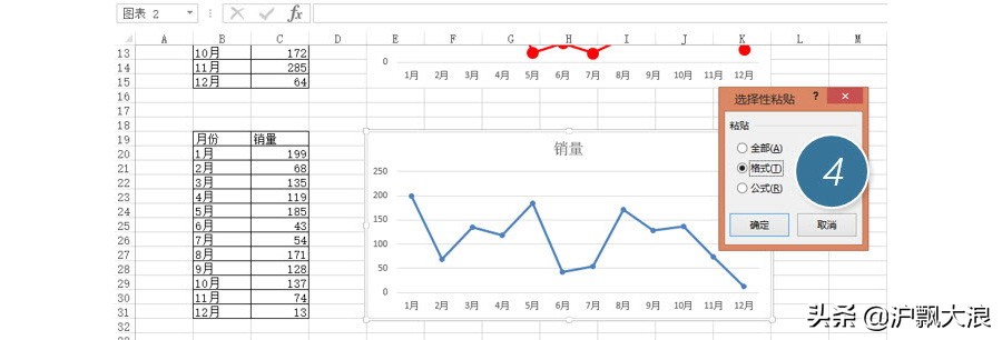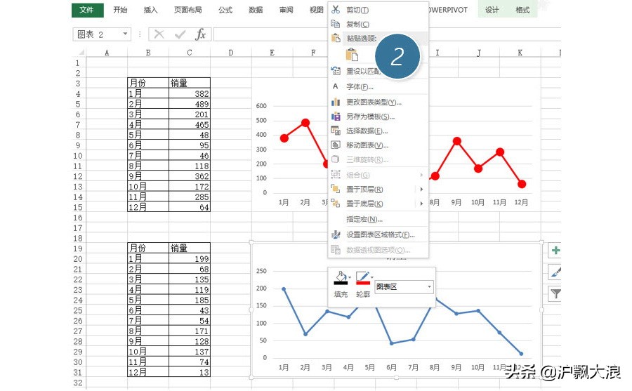 接下来怎么操作啊?您可能猜到了,是不是选中默认格式图表,黏贴到下面的图表啊 ?(下图 2 处)我们试试。如果你真那么操作就上当了。直接黏贴其实是把两个表的数据坐在来一个图表里。