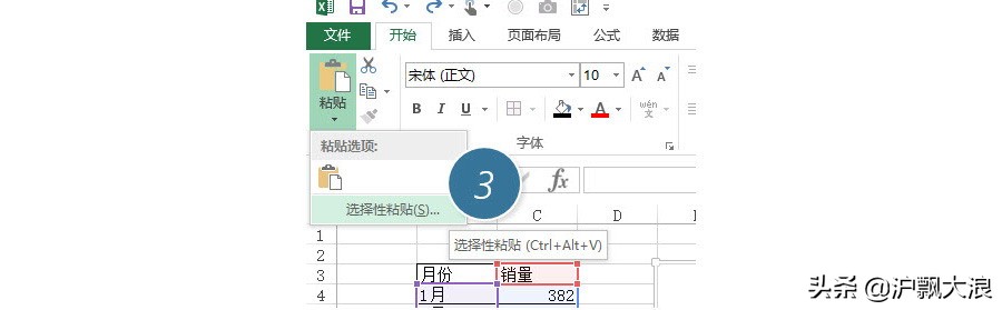 那到底怎么能复制格式呢?首先还是复制设置好格式的图表,和图1 处一样,只是这第二步操作在这里,点击“开始-黏贴-黏贴选项-选择性黏贴”按钮。这里注意看选择性黏贴的快捷键(Ctrl+ALT+V) 下图 3 处。