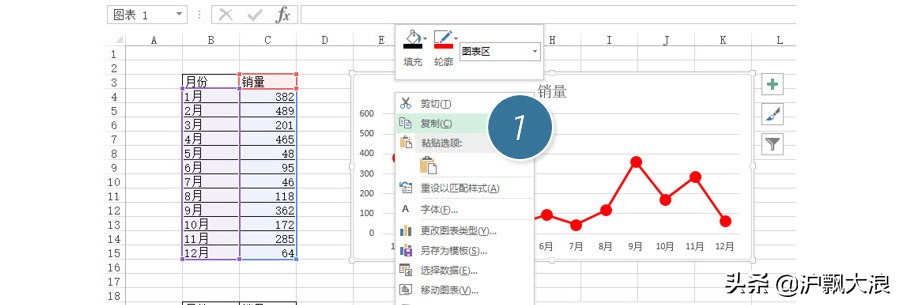 具体操作如下:首先选中设置好格式的图表,然后点击复制。下图 1 处。
