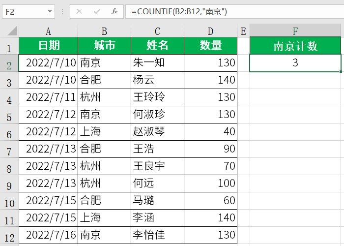 =COUNTIF(B2:B12,"南京")