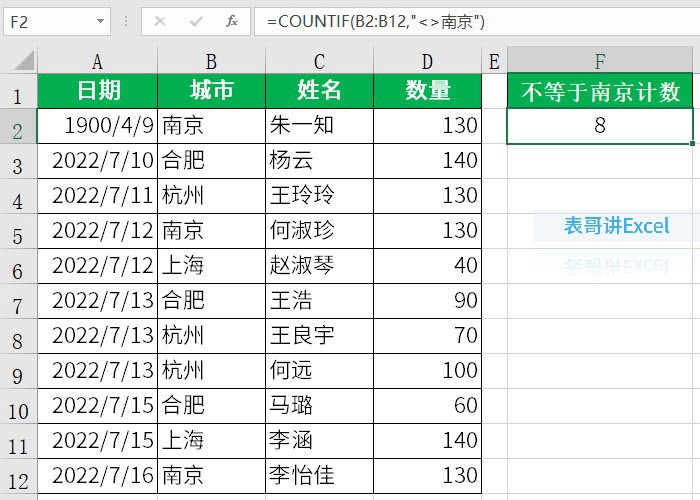 =COUNTIF(B2:B12,"<>南京")