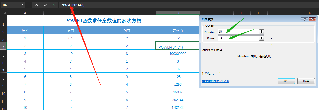 下面我们在计算一下4的0.5次方根是多少?计算的具体公式为:=POWER(B3,C3)