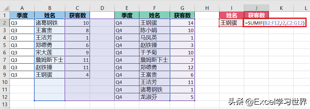 下图 1 中蓝、绿两个表分别是部分员工三季度和四季度的获客数列表,请根据红色表格中列出的姓名,计算出相关人员的总获客数。
