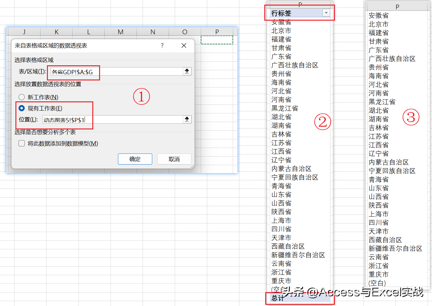 选择数据源A:G列,插入数据透视表到新工作表的P1单元格。将[地区]字段拖拽到[行区域]。再隐藏数据透视表的字段标题、禁用行和列的总计。