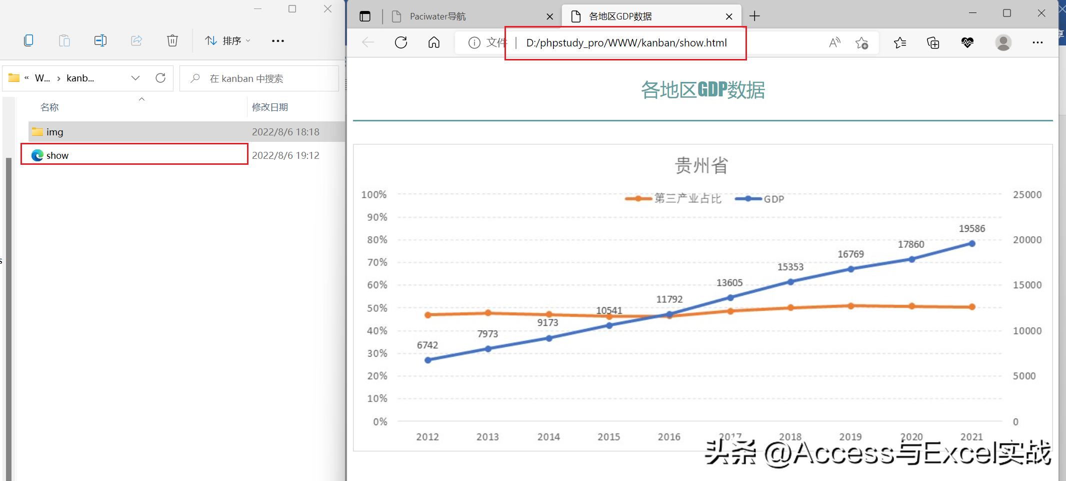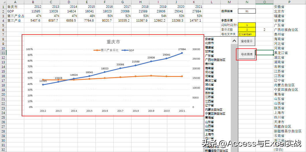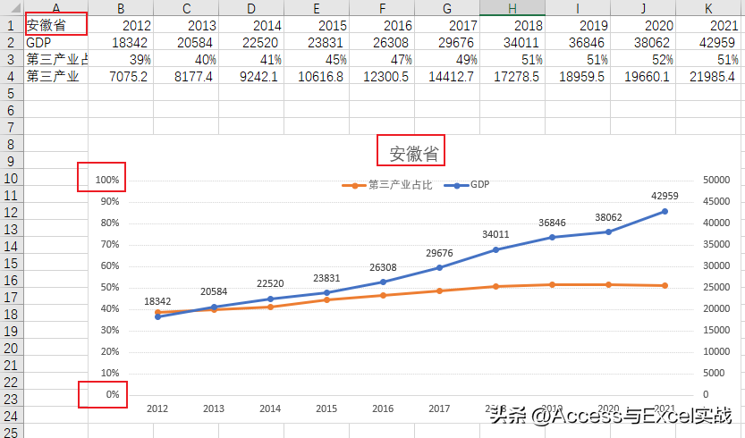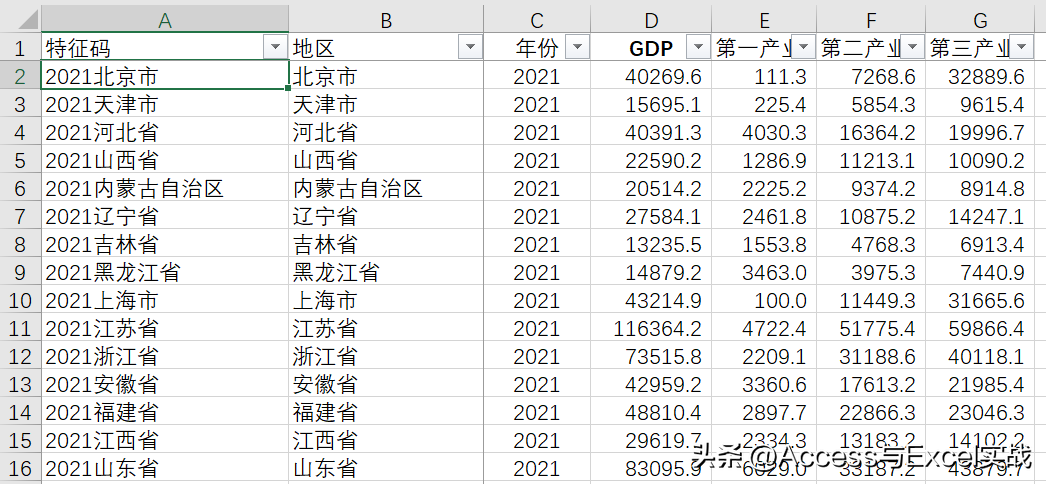 数据源格式如下图,每一行为各地的GDP及三产业数据,A列作为辅助区域(由C列和B列合并而成)。