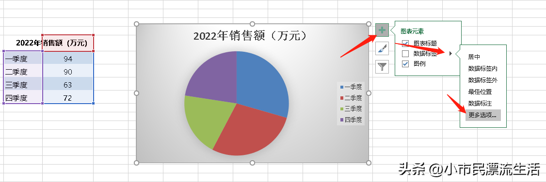 选中图表,单击图表右上加的+图标按钮,接着选择列表中*数据标签*右侧三角形标识,选择*更多选项*。