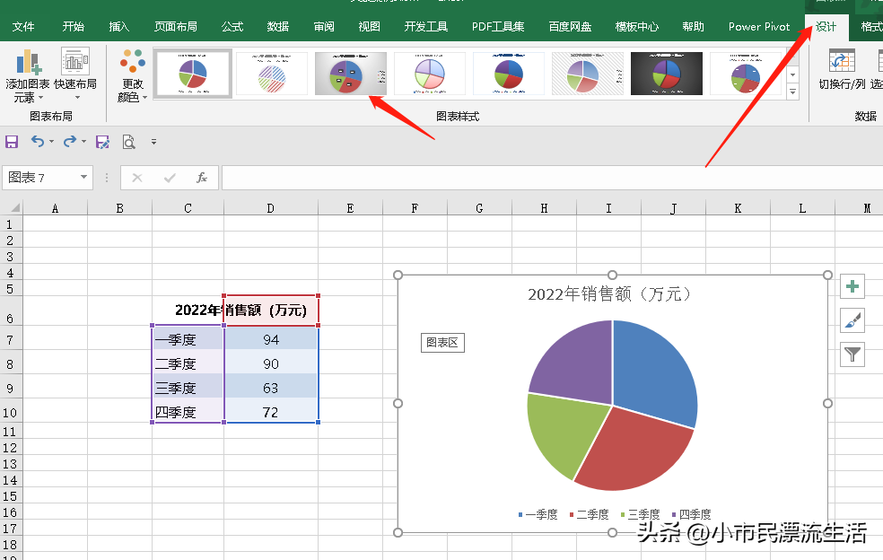 选中图表,在工作表顶部的图表的专属【涉及】选项卡,在*图表样式*分组中选择一种需要的样式。