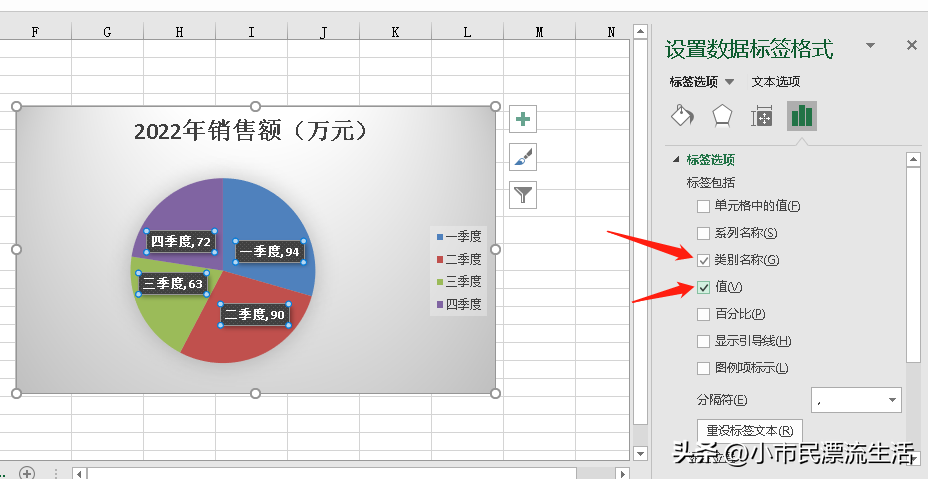 在【设置数据标签格式】对话框界面,单击*类别名称*和*值*,使其左侧复选框增加√标识,此时饼图增加了类别名称季度和销售金额。