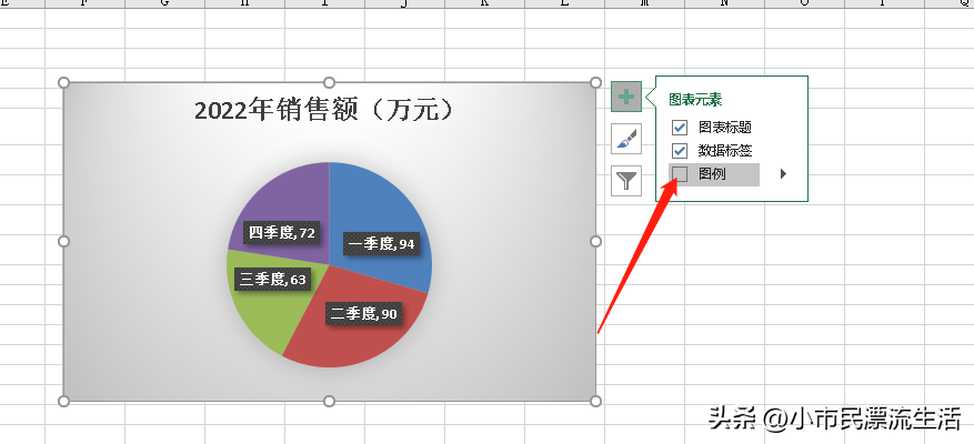 在上一步使用数据标签已在饼图上增加了季度名称,饼图不需要在单独显示图例信息,选中图表,单击图表右上加的+图标按钮,单击*图例*取消复选框中的√标识。